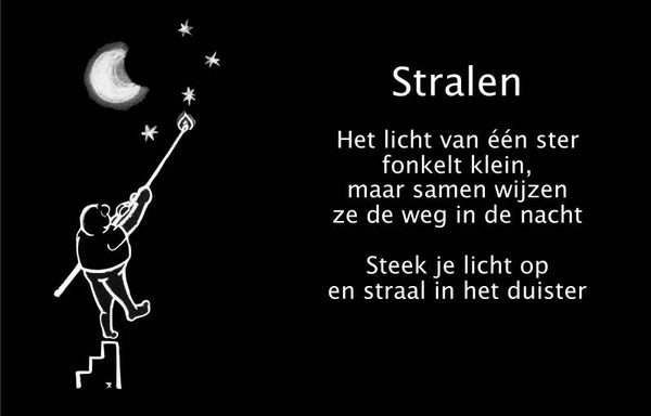 T-shirts van biokatoen. Met een knipoog kun je als drager van dit shirt zelf ook een beetje licht geven. Zowel door de aanschaf als door het dragen. Op de mouw staat heel klein ZOA een prachtige orgnasiatie die werkt in rampgebieden. Je betaald geen porto maar als het lukt is het mooi als de lichtdrager kan ophalen of wij het bezorgen. Van elk shirt gaat er €10,- naar ZOA